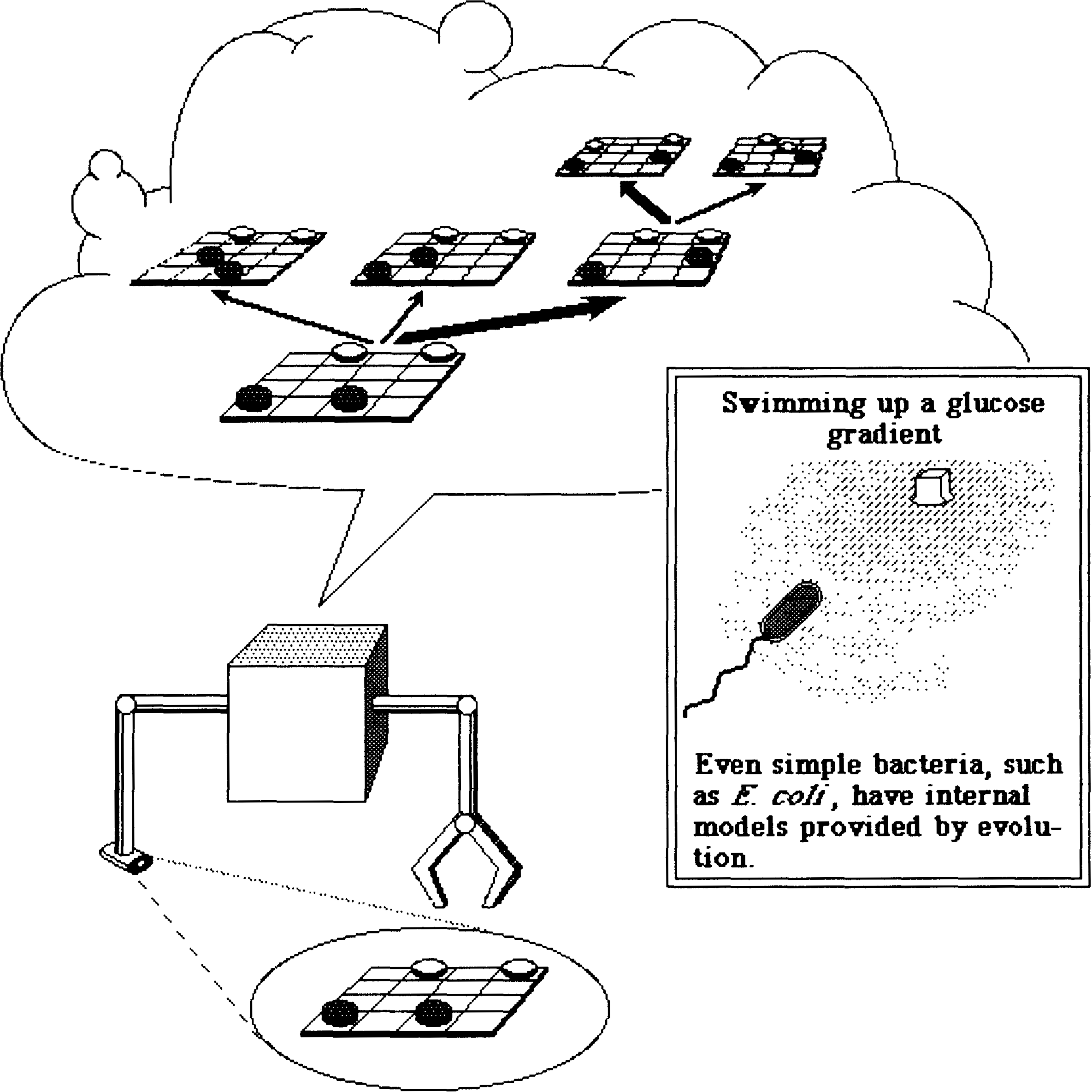 A tacit internal model simply prescribes a current action, under an implicit prediction of some desired future state, as in the case of the bacterium.