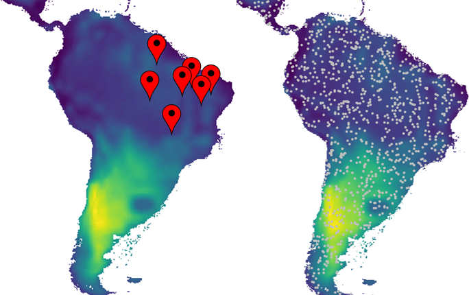 Data on occurrence \(+\) Environmental variables \(+\) Random background points \(=\) Predict where a species is likely to be found