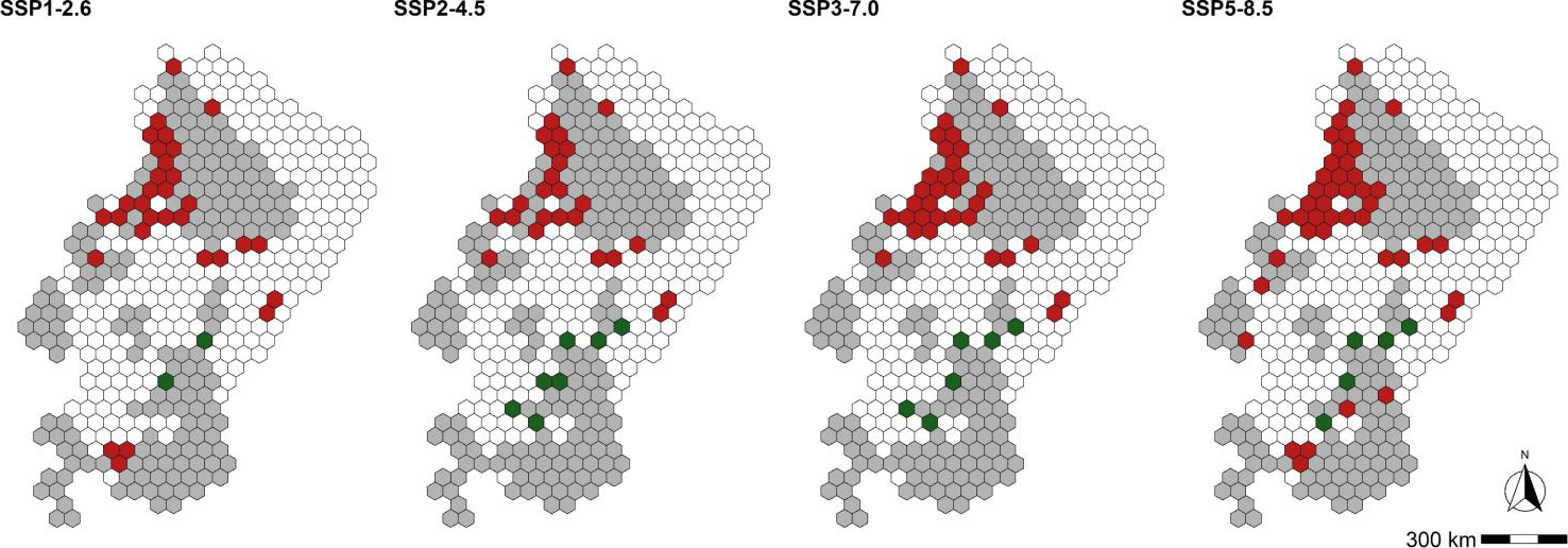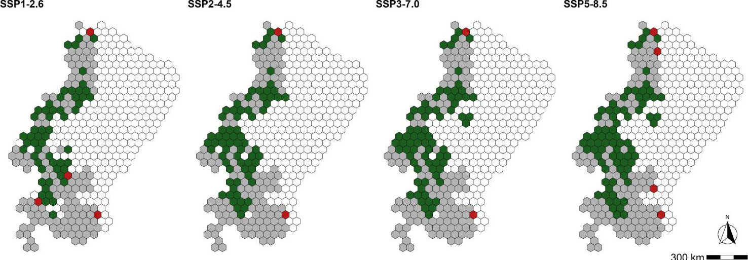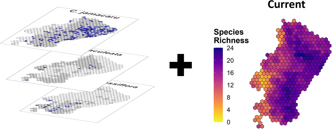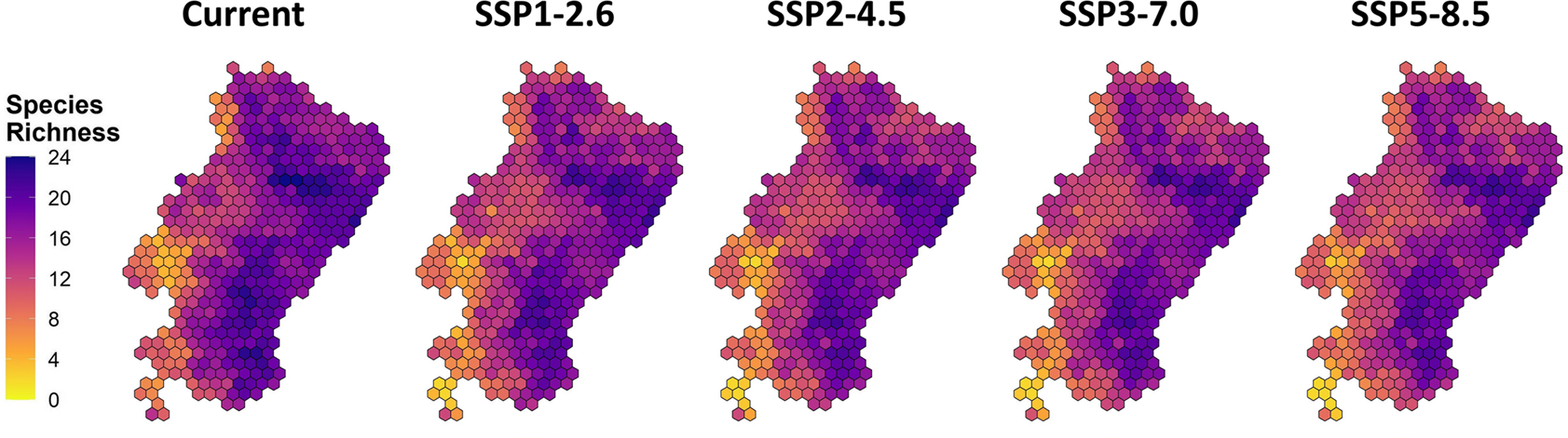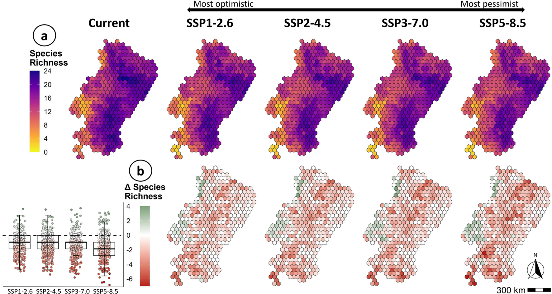 The hex grid was superimposed on the geographical distribution polygons of each species, and species richness was estimated by the sum of the number of species found in each hexagon for each climate scenario (current and future).