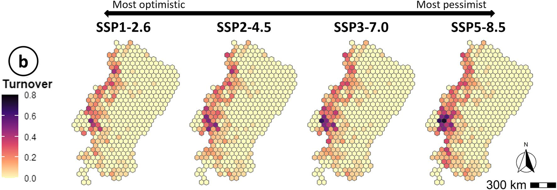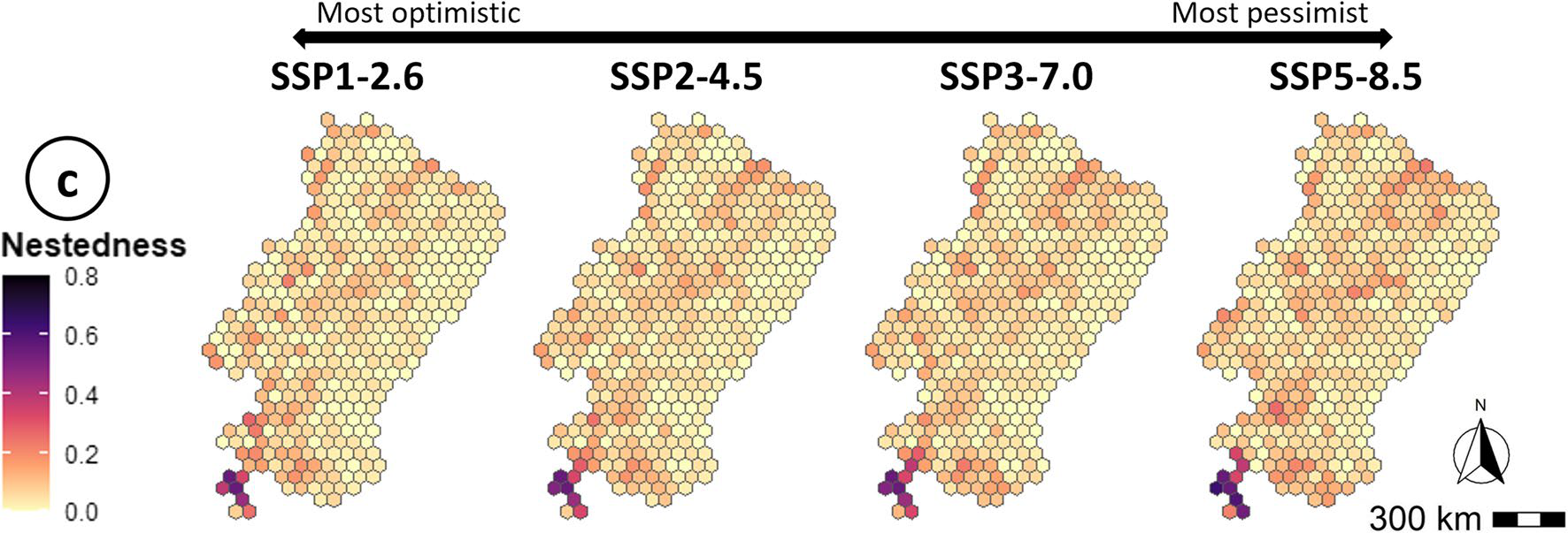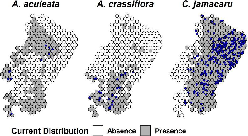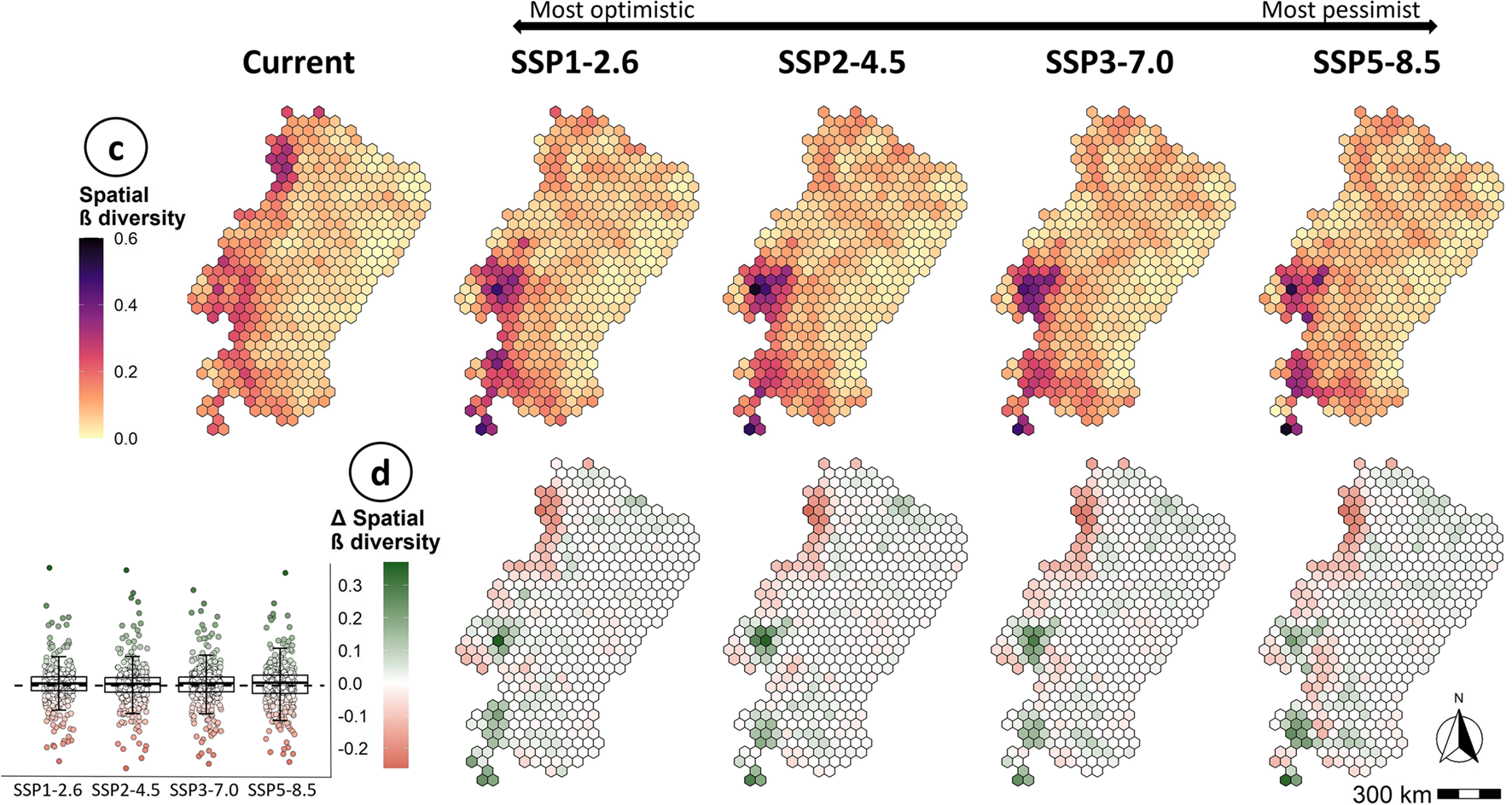 The hex grid was superimposed on the geographical distribution polygons of each species, and species richness was estimated by the sum of the number of species found in each hexagon for each climate scenario (current and future).