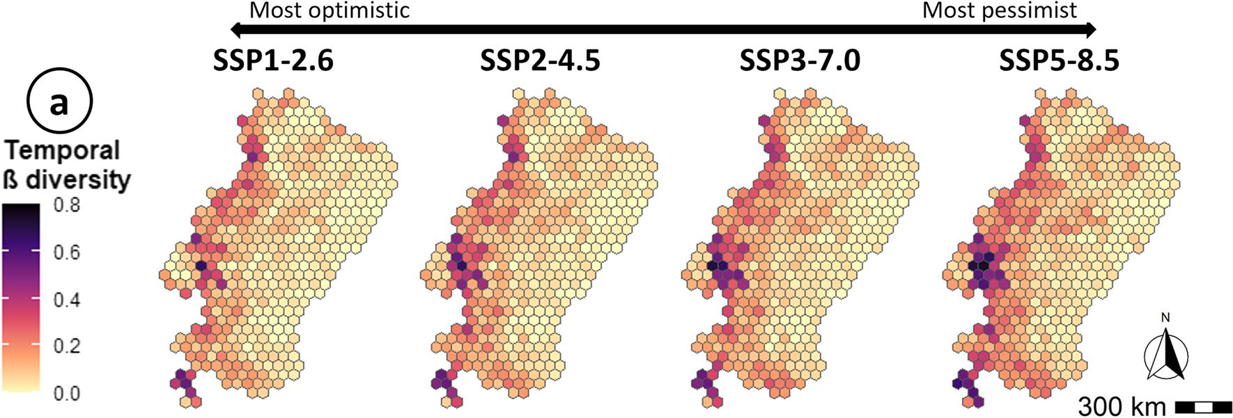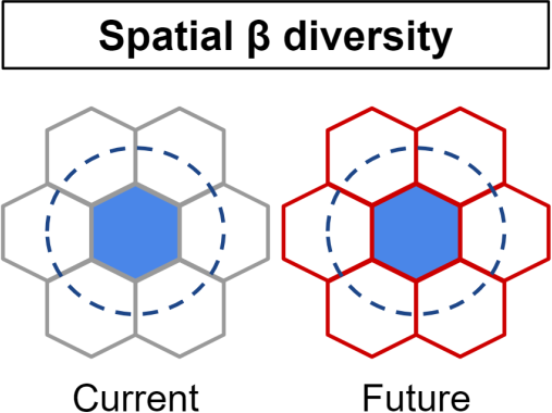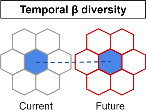Temporal Beta Diversity quantifies the difference in species composition between a focal cell and the same cell in a future scenario.