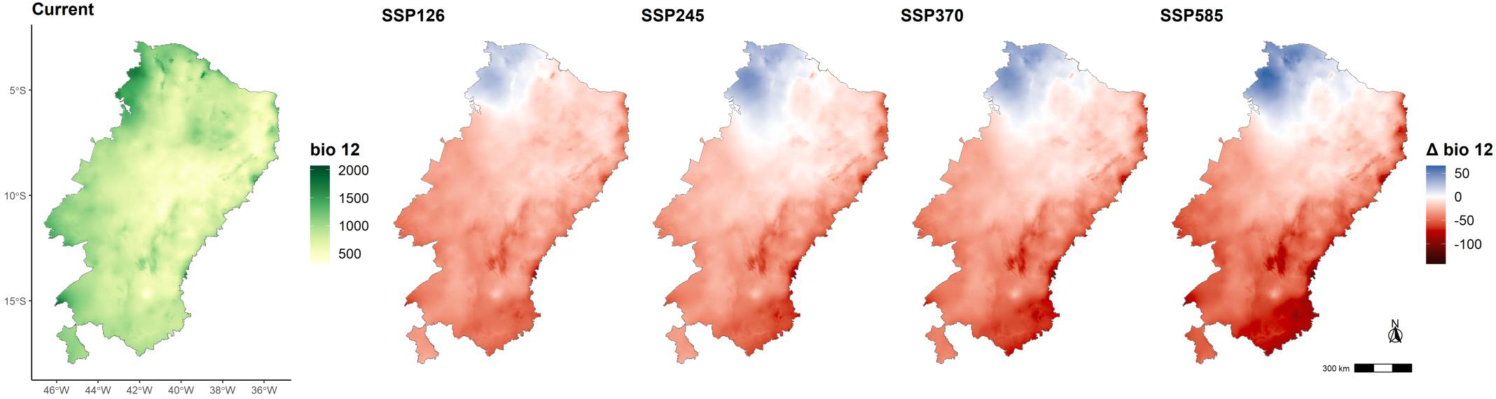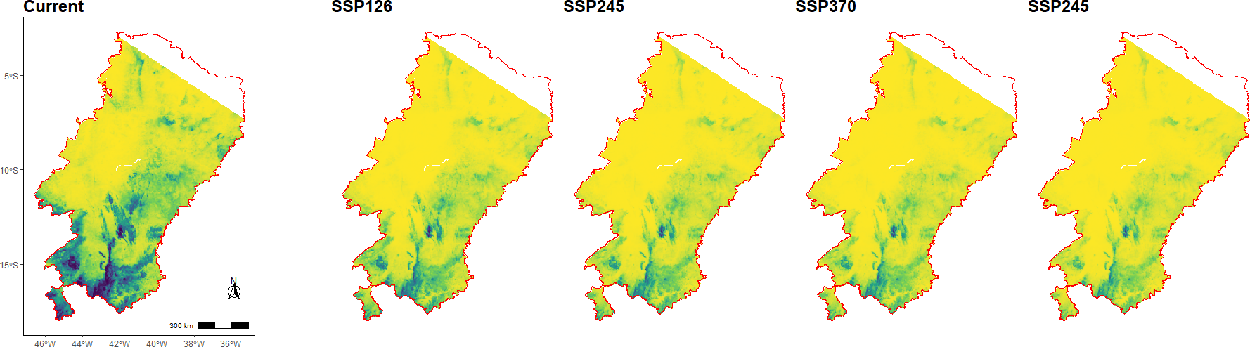 Annual precipitation in the Brazilian Semiarid region for the current scenario (represented on a yellow-green scale) and the same but across four future climate change projections (represented on a red-white-blue scale). The current scenario considers the historical climate of the period 1970-2000. The projected climate changes are for the period 2041-2060