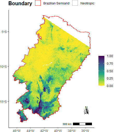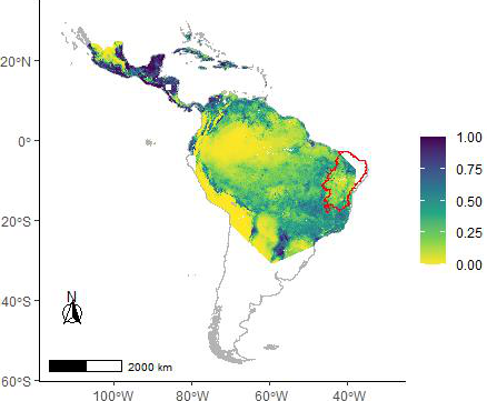 Habitat suitability map for Annona crassiflora (Marolo/Pinha-do-cerrado). Suitability surfaces are presented within the known extent of occurrence (EOO) and clipped by the Semiarid region. Blank areas represent locations where species have no known occurrence (extend beyond the EOO).