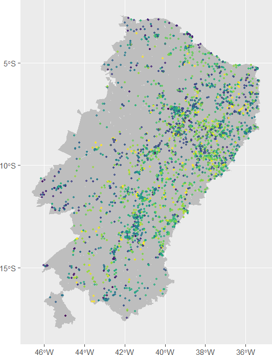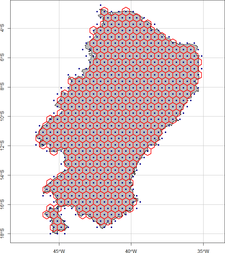 The gray map represents the spatial extent of the Brazilian Semiarid region. The blue dots represent the centroids of the hexagons.
