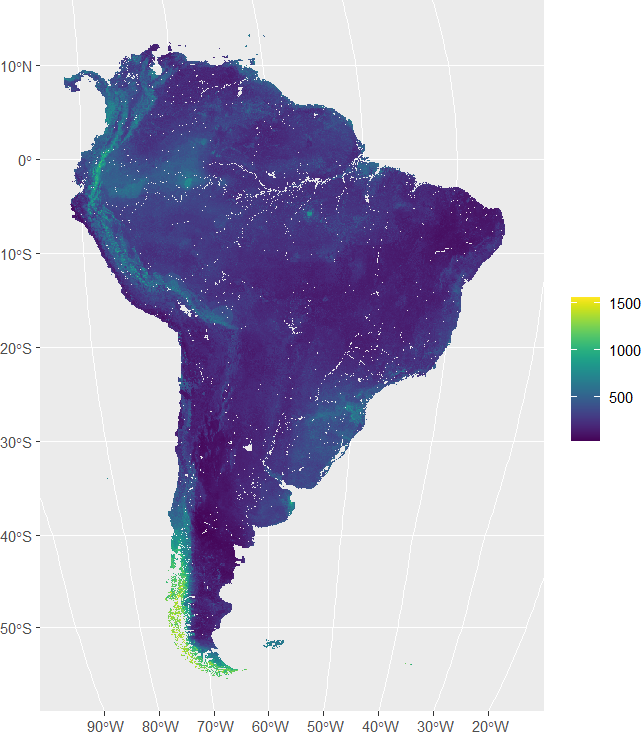 Soil total nitrogen concentration (in cg/kg) at a depth of 0-5 cm for each 5000 m cell, based on the latest release of the SoilGrids database (May 2020).