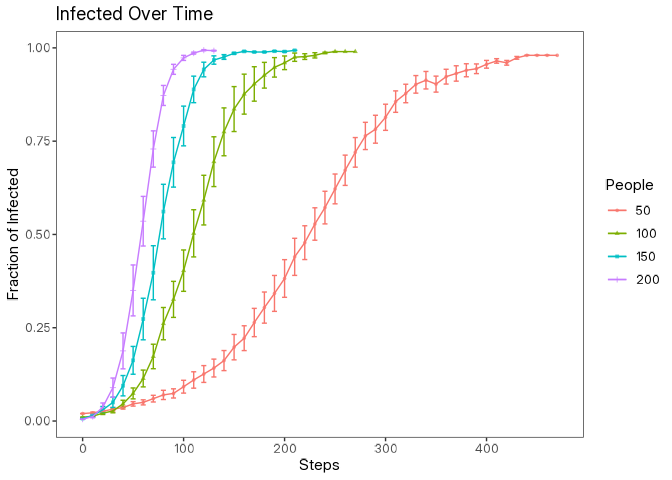 data |> glimpse()Now we can create a simple plot using the ggplot2 package to visualize how the fraction of infected individuals changes over time for different population sizes along with error bars representing the standard error.