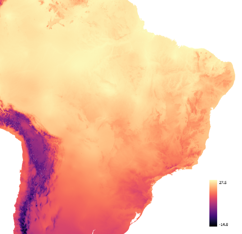 (WorldClim 2.1 data. June mean temperature (°C) in South America (1970-2000))
