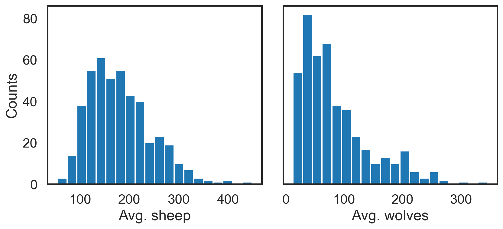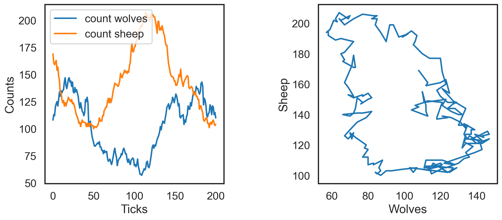 = netlogo.repeat_report(["count wolves", "count sheep"], 200, go="go") counts
