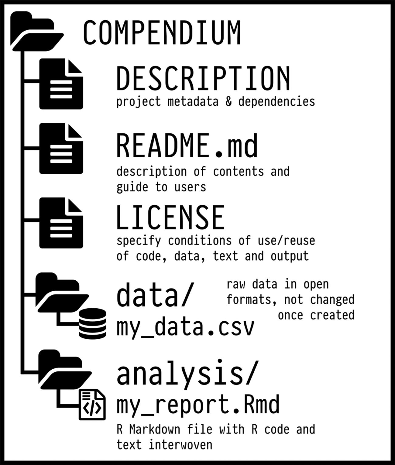 It is important to have a structured project directory. A best practice is to follow the structure made for R Packages (Marwick et al., 2018).