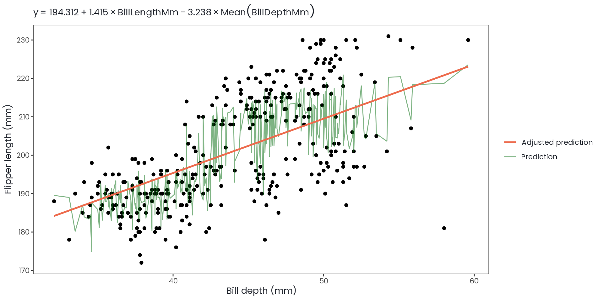 #> Type II error rate = 0Adding bill_depth_mm as a predictor meaningful improve the prediction of flipper_length_mm?