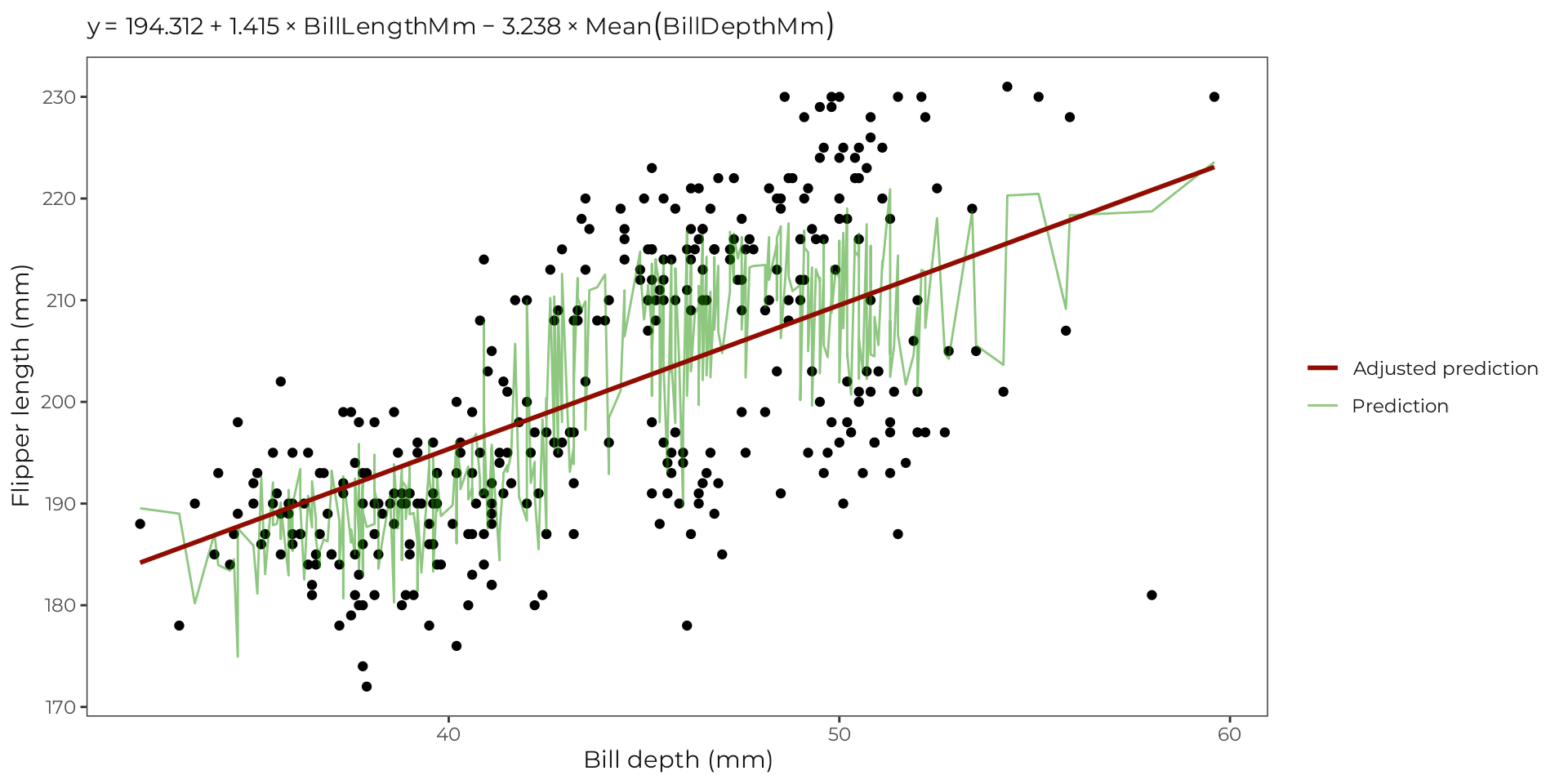 #> Statistical Power = 1 <<Adding bill_depth_mm as a predictor meaningful improve the prediction of flipper_length_mm?
