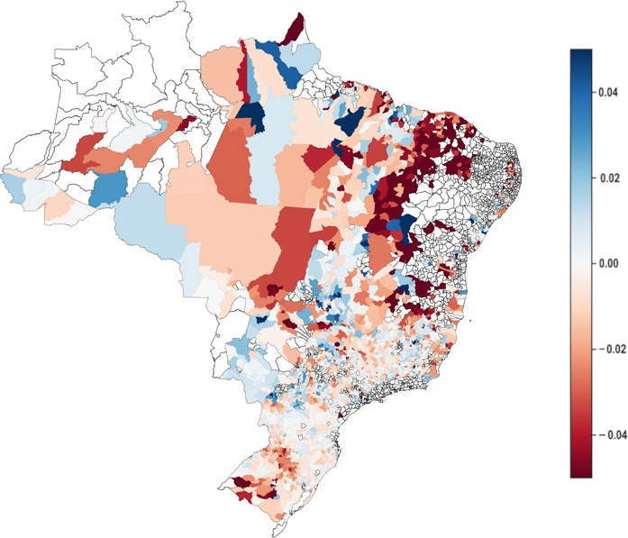 Variação na produtividade média do milho associada à variabilidade climática no Brasil durante o período de 2017–2022. Áreas em azul indicam um aumento na produtividade média, enquanto áreas em vermelho indicam uma redução.